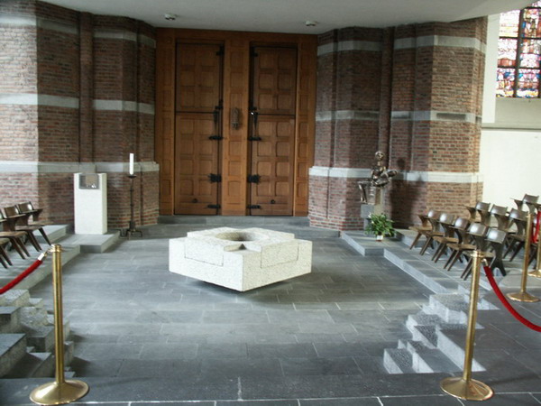 3 Stufen fuhren hinab zum Ort der Taufe. Dem Taufstein in der Mitte von Waldemar Kuhn ist ein kleiner Tabernakel zugeordnet, der die drei Heiligen Ole bewahrt, die zur Spendung von Sakramenten benötigt werden.