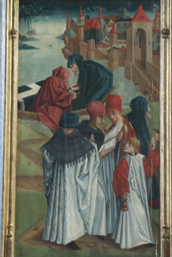 Hinter dem zweiten Bankblock bietet eine Granitstele zwei Kunstwerken des Mittelalters Halt: zunächst einem Altarseitenflügel von ca. 1480; es handelt sich um die Darstellung der wundersamen Beisetzung des Werenfried van Eist.